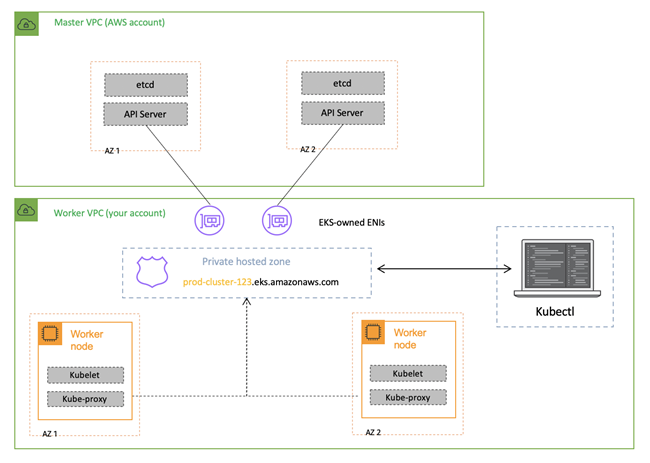 对于EKS来讲,在创建新的Kubernetes集群的时候,EKS会为与集群通信的托管Kubernetes API服务器创建一个终端节点。默认情况下,这个API终端节点对于Internet是公有的,对API终端节点的访问,我们使用AWS IAM和Kubernetes RBAC的组合加以保护。但是我们建议您启动Kubernetes API终端节点的私有访问,以使得工作节点和API终端节点之间的所有通信都在VPC之内。您可以限制从Internet访问API终端节点的IP地址,或者完全禁用对API终端节点的Internet访问。