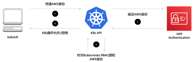 下面我们看一下Kubernetes的管理工具kubectl的执行过程是如何在EKS上进行身份认证的。比如说启动命令kubectl get pods,在这里我们通过kubectl访问Kubernetes的API,在其中我们会传递AWS相关的身份信息,Kubernetes会向IAM验证身份信息,这里我们会用到IAM认证的一个插件,aws-iam-authenticator,它是AWS官方用于连接验证身份信息的一个工具,验证返回之后,Kubernetes API针对RBAC来授权AWS身份的资源访问权限,最后向kubectl返回执行结果是允许还是拒绝。