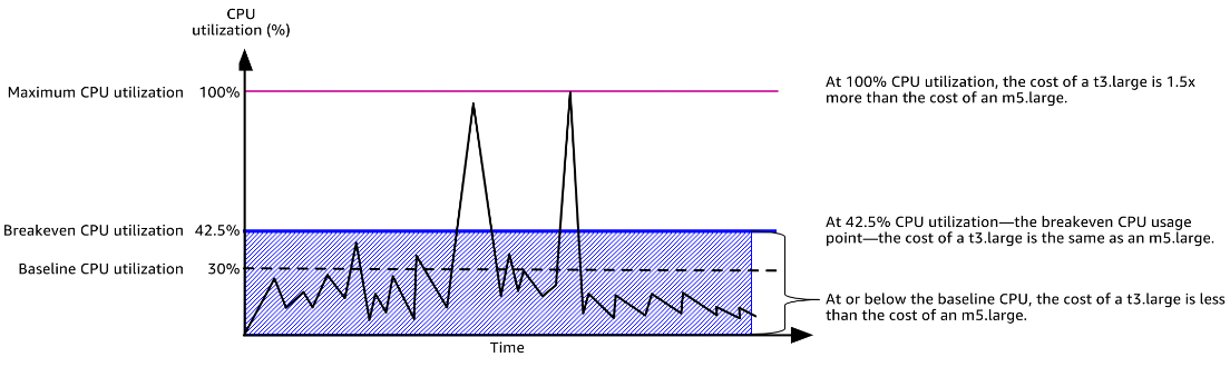 如果工作负载需要低于 42.5% 的平均 CPU 使用率,您可以受益于 t3.large 的较低价格,同时获得与 m5.large 相同的性能。