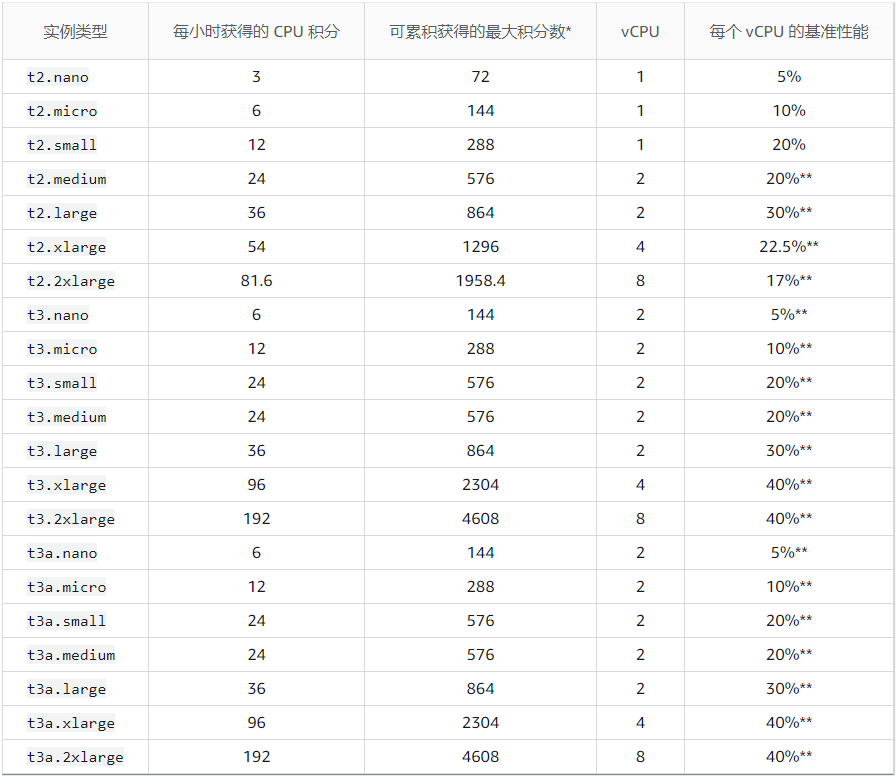 传统 Amazon EC2 实例类型提供固定的性能,而可突增性能实例提供基准水平的 CPU 性能并能够突增到基准水平之上。如果你的实例CPU负载超过了基准性能,此时就会使用CPU积分,每个积分允许你一个vCPU利用率达到100%,运行一分钟;如果你的实例CPU少于基准性能(例如,处于空闲状态时),每小时也会获得一定积分,当然每个可突增实例的CPU积分累计也是有上限的,详见下面的表格。