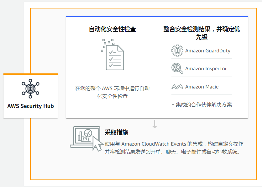 将 AWS Security Hub 与 Amazon CloudWatch Events 集成后,您将能创建自定义响应和补救工作流程。您可以轻松地将检测结果发送到 SIEM、聊天工具、开单系统、安全业务流程自动化和响应工具及呼叫待命管理平台。您也可以使用 AWS System Manager 自动化文档、AWS Step Functions 和 AWS Lambda 函数构建可从 Security Hub 启动的自动补救工作流程。