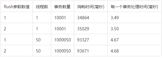 游戏服务器一般包含两个线程组,分别是Request Thread Group和后台线程Schedule Group,每一个Request的处理和Schedule event的处理都由数据库的Transaction来保护。本次测试主要评估空Transaction(只有begin和commit,没有任何实质sql)的情况,以便了解Transaction机制的时间消耗以及flush参数的相关影响,测试结果表格如下