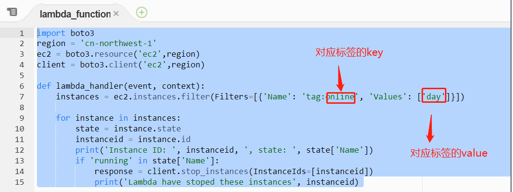 1.如果不想用key:online value:day的标签想用其他的标签则需要修改lambda函数代码(注意四个函数都要修改)点击要修改的lambda函数名找到函数代码部分如下图: