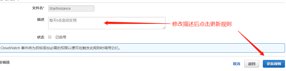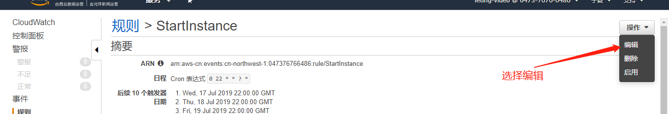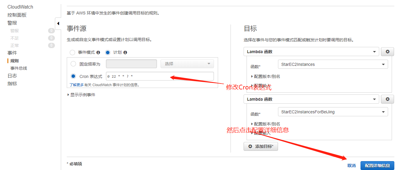 - 想要修改EC2实例启停时间只需要修改CloudWatch规则的Corn表达式即可,Cron的具体格式可参考官方文档:https://docs.aws.amazon.com/zh_cn/AmazonCloudWatch/latest/events/ScheduledEvents.html