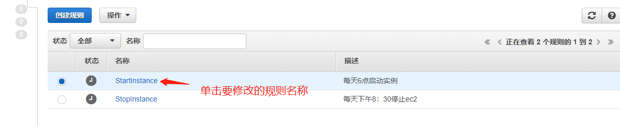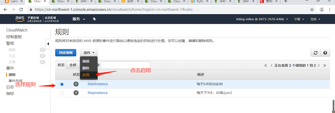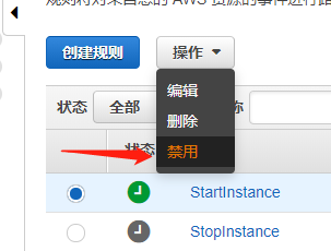 - CloudWatch中创建了两个规则 StartInstance、StopInstance