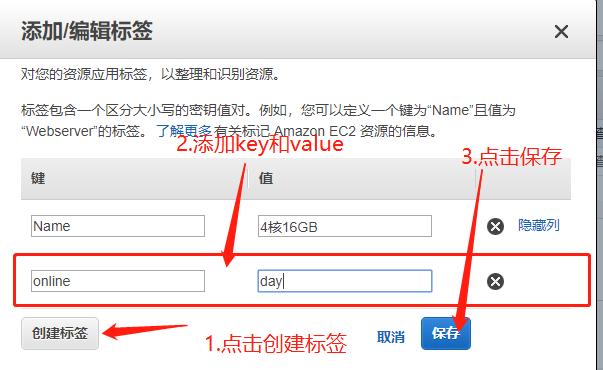 1. 为要实现自动启停的实例配置标签且标签的key必须是online,value必须是day 如图: