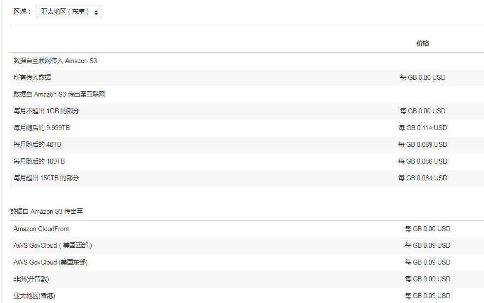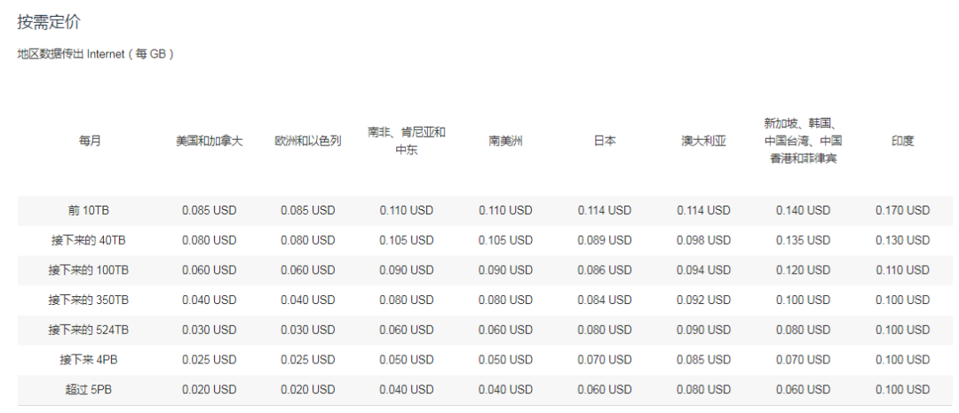 CloudFront是专门为减少EC2到互联网传输的费用而设计,比如托管一个向公众提供内容的网站可能产生的费用。CloudFront数据传输按下表收费,在某些区域相比互联网数据传输费用更便宜一些。