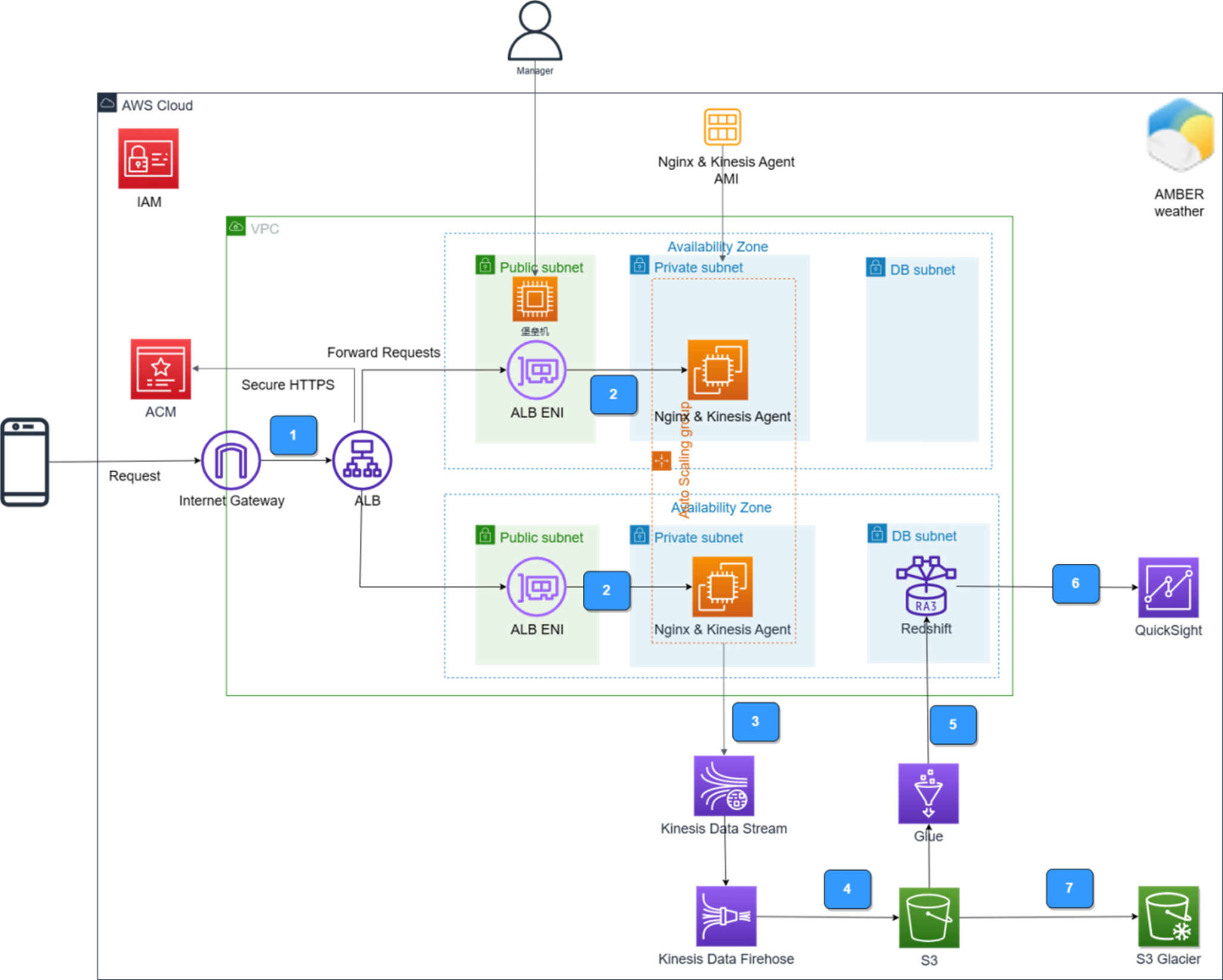 使用自动扩缩的EC2部署Nginx服务来收集埋点日志,使用Kinesis将数据传输到S3中进行存储,使用Glue对数据进行清洗,使用Redshift作为数据仓库存放数据,使用QuickSight对Redshift中加工后的数据进行可视化展示,使用S3 Glacier对原始日志和历史数据进行归档存储,以降低存储费用。
