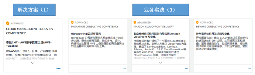 神州泰岳是AWS全球分销商和高级咨询合作伙伴。神州泰岳获得4项AWS 能力,包括:解决方案1项;业务实践2项;AWS 服务验证1项。