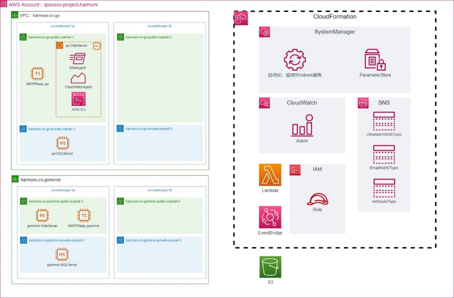 神州泰岳采用多个AWS产品及开发服务实现了对业务系统的监控需求。包括:通过AWS CloudWatch监控EC2状态、CPU/内存/磁盘利用率;通过SSM定制开发实现对Windows服务状态监控;通过开发Lambda监控Web服务的可用性。通过AWS SNS发送告警邮件。以下是Harmoni的监控架构。