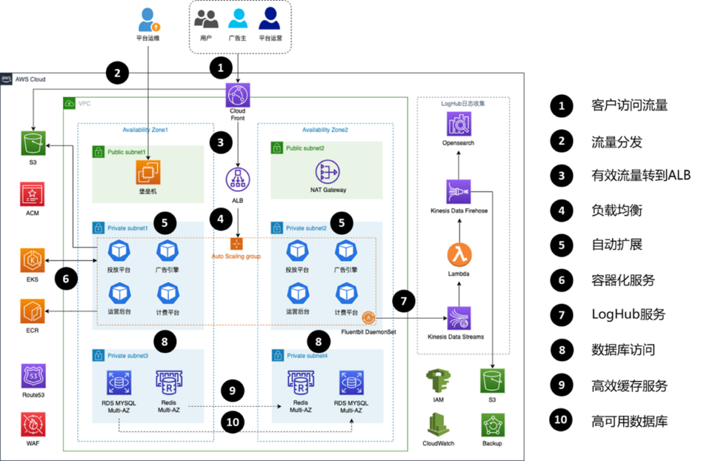 2023年4月,神州泰岳协助客户完成广告平台业务在AWS Golcbal区的部署、上线。这个广告平台业务内容包含广告投放平台、广告引擎、运营后台、计费平台,广告主通过广告投放平台进行投放,运营人员通过运营后台进行投放策略制定、广告审核,计费平台通过统计数据生成订单流水,通过广告引擎为终端用户请求匹配最优广告内容。涉及的主要AWS产品包括: