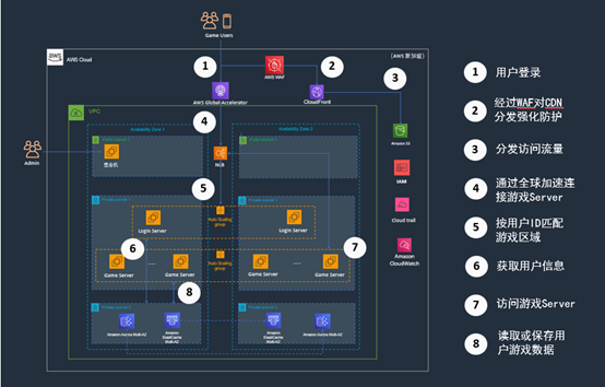 采用Amazon EC2 承载游戏服务,Auto Scaling 组依 CPU 利用率自动扩缩容。ElastiCache for redis 缓存数据,Aurora MySQL 保障数据库高可靠并存储多类信息。CloudFront 与 S3 分发静态文件,预热加速交付,WAF 过滤访问并记录日志。用户经 GA 登录,流量经 ALB 转发至 Login Server,选游戏后再分配至对应 Game Server。IAM 管理访问,AWS Shield 防护 DDoS 攻击。运维方面,Amazon CloudWatch 等工具监控分析,助开发运维团队维护平台后端与用户数据安全,保障应用稳定运行。应用架构中设计的主要AWS产品包括: