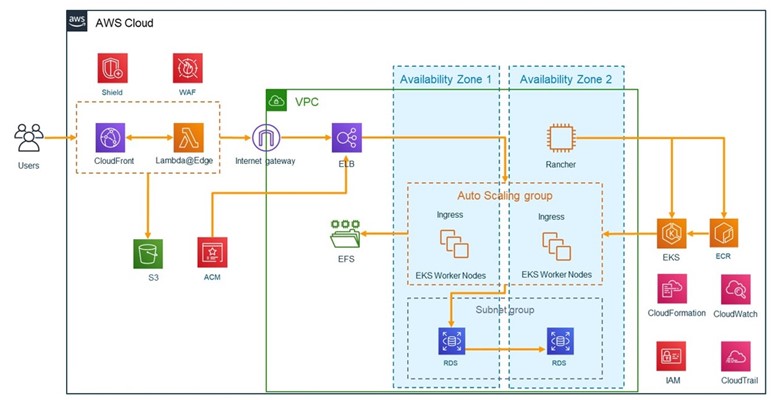 In this project, Ultrapower provides a customized PAAS platform for Chicv. The platform uses AWS hosting services including ECR, EKS (including EC2, VPC, ALB), EBS, EFS, S3, RDS, Cloudwatch, etc. The third-party products including Rancher, Prometheus, Grafana, ELK, and all integrates with Chicv’s existing GitLab and Jekins.